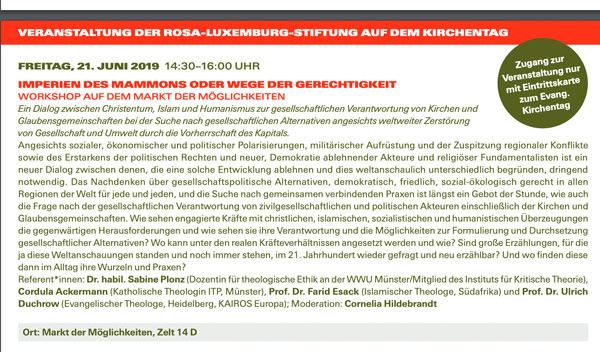 Der Brustton der Überzeugung verwunderte. Also stellten wir klar, dass Duchrow und Esack auf dem Kirchentag auftreten und verwiesen auf den Veranstaltungshinweis der Rosa-Luxemburg-Stiftung:
