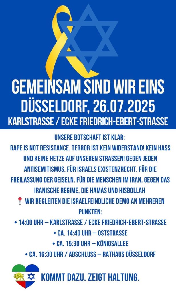 Am 26. Juli 2025 demonstriert die KöAntifa, mit anderen Gruppen, unter dem Motto GEMEINSAM SIND WIR EINS in Düsseldorf gegen Antisemitismus, für das Existenzrecht Israels und für die Freilassung der Geiseln. Anlass: Eine israelfeindliche Demonstration, die von der KöAntifa an mehreren Punkten „begleitet“ wird.