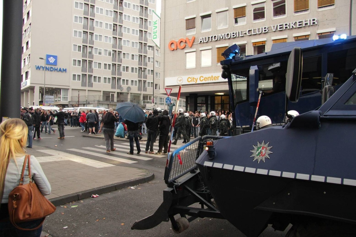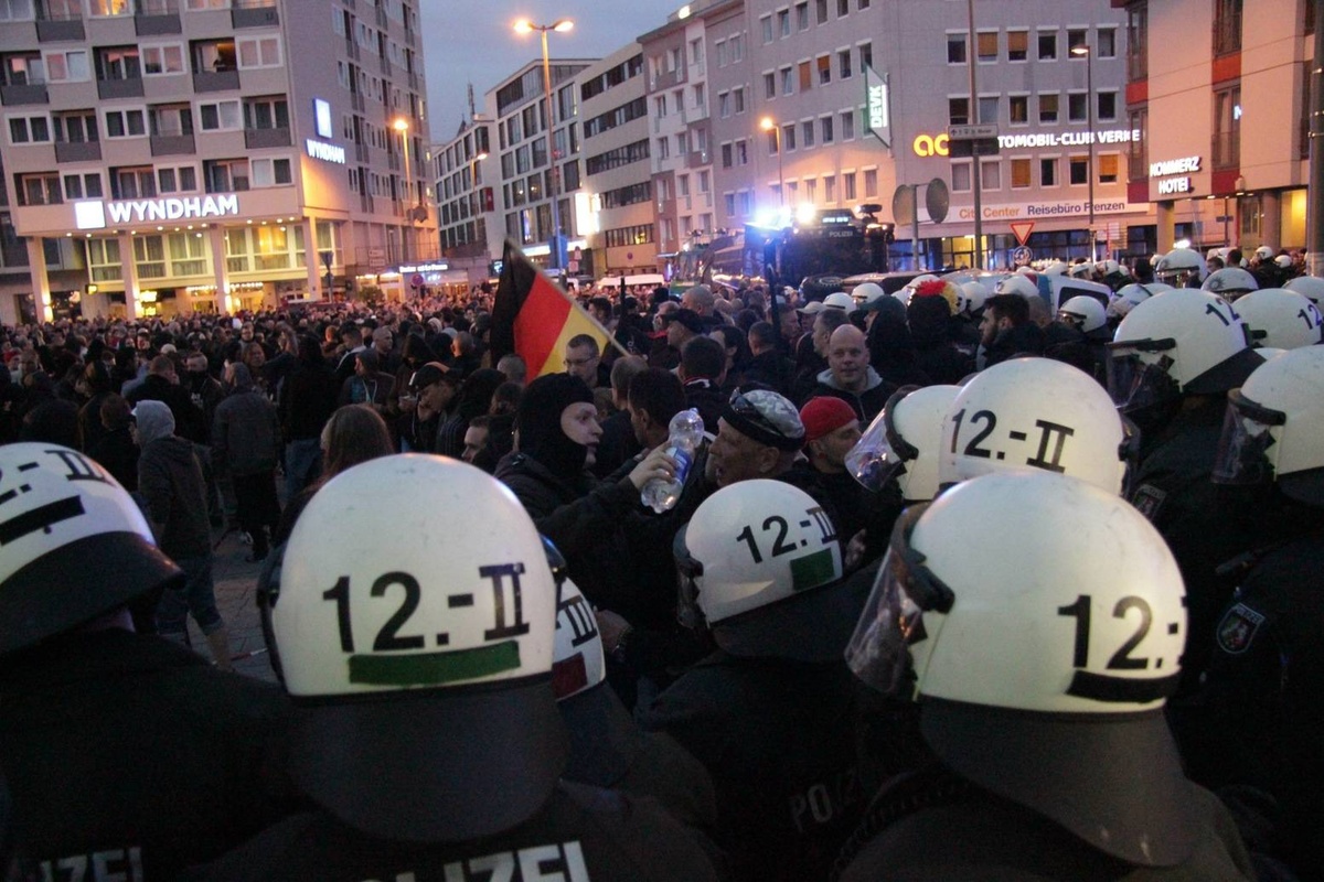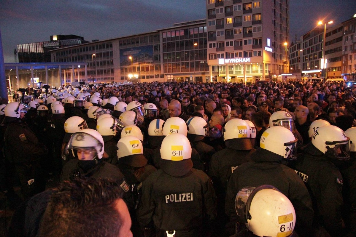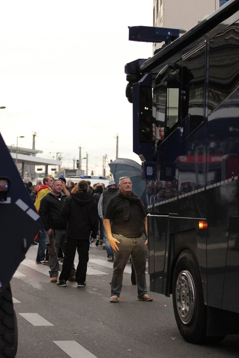 Doch die Polizei ist kaum zu sehen und sie ist später dann völlig überfordert als sie eingreifen will und Flaschen, Steine und Böller auf sie – und auf Journalisten – fliegen. Weit über 6.000 Teilnehmer hatten sich per Facebook angekündigt. Die Polizei ging von höchstens 1.500 rechten Hooligans aus und schickte nur 1.000 Beamte, die einen ungewöhnlichen Plan hatten: Deeskalationsstrategie. Die Bilanz: 44 verletzte Polizisten und gerade 17 vorübergehende Festnahmen.
