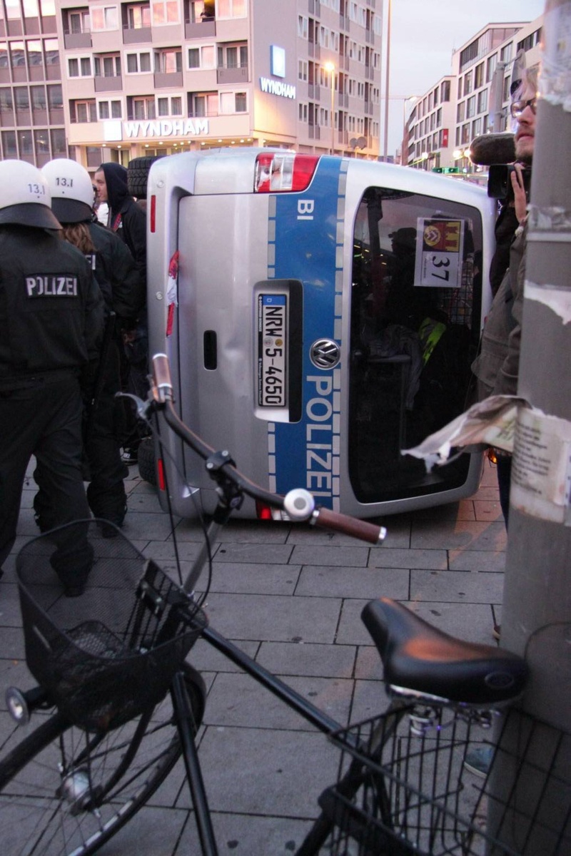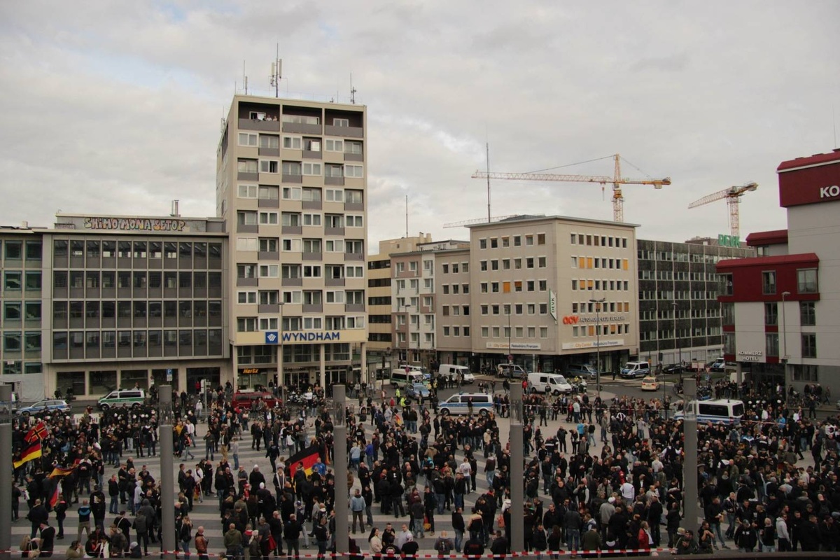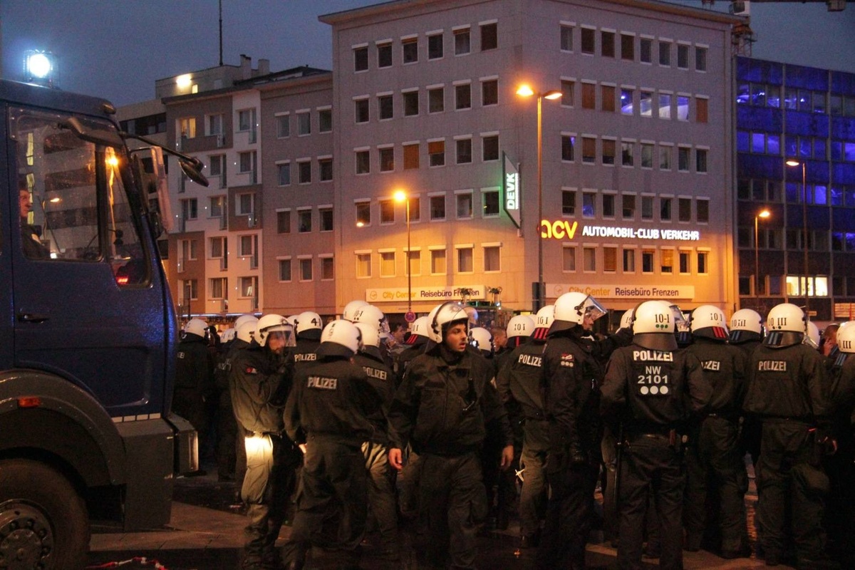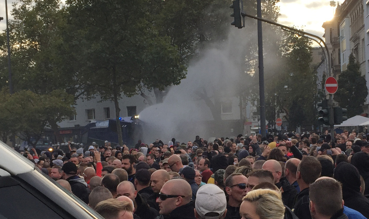 Doch die Polizei ist kaum zu sehen und sie ist später dann völlig überfordert als sie eingreifen will und Flaschen, Steine und Böller auf sie – und auf Journalisten – fliegen. Weit über 6.000 Teilnehmer hatten sich per Facebook angekündigt. Die Polizei ging von höchstens 1.500 rechten Hooligans aus und schickte nur 1.000 Beamte, die einen ungewöhnlichen Plan hatten: Deeskalationsstrategie. Die Bilanz: 44 verletzte Polizisten und gerade 17 vorübergehende Festnahmen.