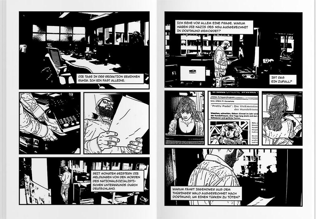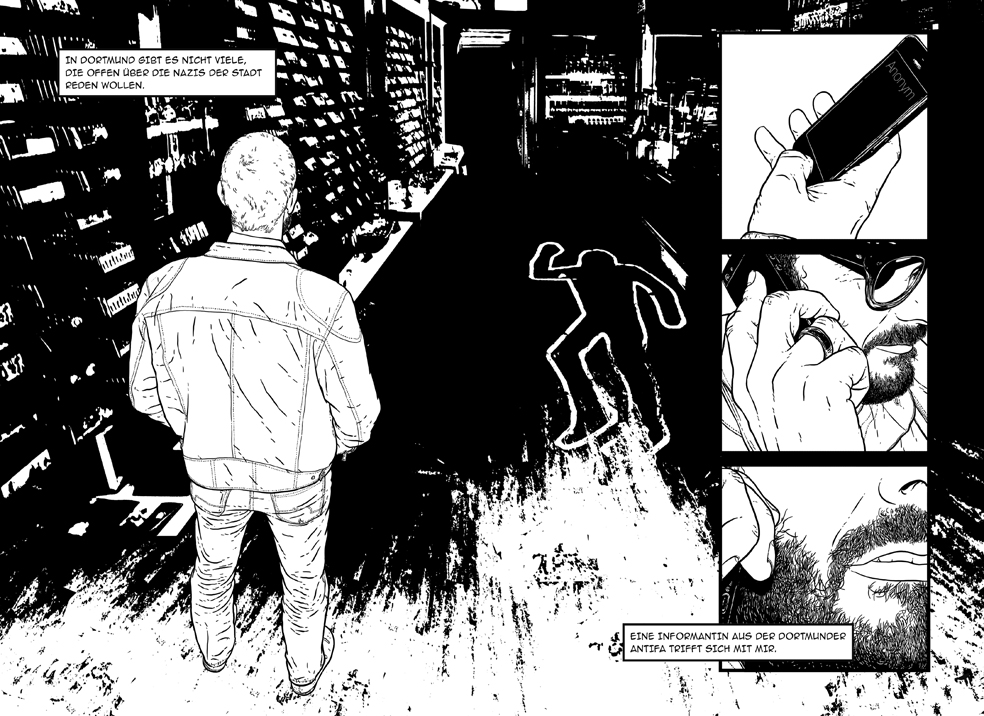In der grafischen Reportage „Weisse Wölfe“ zeichnet er gemeinsam mit Jan Feindt ihren Weg nach. Sie folgen einem Jugendlichen, der immer tiefer in eine Welt aus Hass und Rassenwahn abtaucht.