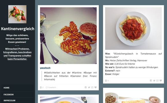 Konrad Lischka hat ein schönes Blog gestartet: Bei Kantinenvergleich werden Bilder von Kantinenessen gepostet. Die Mahlzeiten werden kurz beschrieben, der Preis genannt und auch die Frage, ob Gastesser zugelassen sind, wird beantwortet. Erste Erkenntnisse: Beim Spiegel, wo Konrad arbeitet, sieht alles wunderbar aus, aber auf dem Teller ist eigentlich nur getuntes Kaninchenfutter. Die Heise-Kantine hingegen verspricht leckeren Spaß wie „Würstchengulasch“ in der Mittagspause. Schönes Blog…