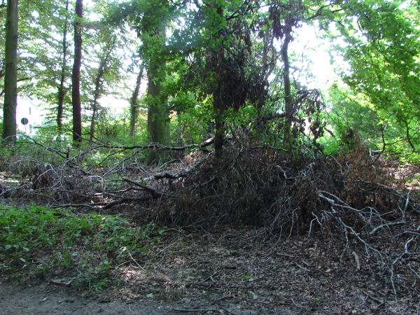 Dieser Wald hier, den wir im Dezember 2014 schon in einem ähnlichen Beitrag zur Bebilderung abgebildet hatten, sieht aktuell z.B. noch genauso aus wie im Winter (Nun natürlich mit deutlch mehr Blättern an den noch stehenden Bäumen am Wegesrand 😉 ). Da war seit Ende 2014 offenkundig z.B. auch niemand mehr zum Aufräumen :