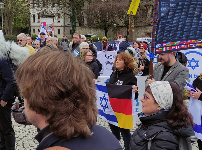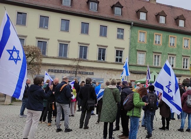 Der Protest gegen diese infame Instrumentalisierung der KZ-Gedenkstätte fand aber dennoch am Sonntag, 12.4.2026, in Weimar statt. Rund 200 Teilnehmer, darunter Vertreter von CDU, SPD, FDP und ver.di sowie von Iron-Dome-Gruppen aus Nürnberg, Hannover, Köln, Bremen, Mannheim, Bonn, Frankfurt, Erlangen und München, hatten sich versammelt, um gegen die Politisierung des Gedenkens an die Schoa zu protestieren. Organisiert wurde die Veranstaltung von Johannes Lösch von der Deutsch-Israelischen Gesellschaft (DIG).