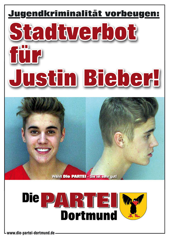 Kriminalität – in keiner Ruhrgebietsstadt ist das Problem so groß wie in Dortmund. Und natürlich ist die Kriminalität auch ein Thema im Kommunalwahlkampf. Die Partei für Arbeit, Rechtsstaat, Tierschutz, Elitenförderung und basisdemokratische Initiative, kurz Die PARTEI in Dortmund tritt nun mit einer radikalen Maßnahme an die Öffentlichkeit: Sie will dem Schlagersäner Justin Bieber Stadtverbot erteilen. Bieber fiel steht im Verdacht, ein Wildpinkler zu sein, in seinem Haus wurden Drogen gefunden und er steuerte ein Kraftfahrzeug ohne gültigen Führerschein. Ein Dortmund ohne Justin Bieber ist ein sichereres Dortmund.