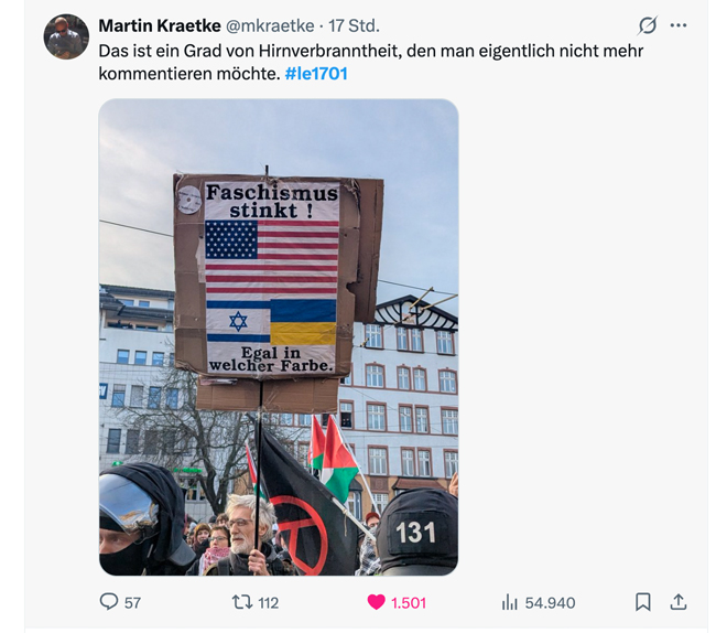 Jedoch gab es gestern wichtigere Demonstrationen, über die zu berichten gewesen wäre. Während man in Leipzig „Yalla Yalla Intifada“-Rufe hörte, sind deutschlandweit Menschen für die Iraner auf die Straße gegangen, die unsere Unterstützung jetzt mehr als jeder andere brauchen. In Städten wie Stuttgart, Düsseldorf, Köln, Rostock, Berlin, Frankfurt, Bielefeld, Nürnberg, München oder Trier demonstrierten sehr viele Menschen für einen freien Iran. In Hamburg waren es mehr als 12.000 Teilnehmer.