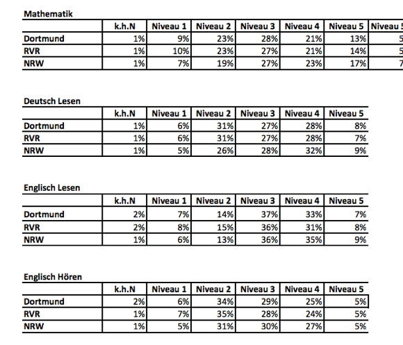 Das Ergebnis: Die Dortmunder Schulen liegen unter dem Landesschnitt. Vor allem wenn es um gute oder sehr gute Leistungen get, fallen die Leistungen der Schüler im Vergleich zum Rest des Landes ab. Innerhalb der Ruhrgebiets liegt Dortmund hingegen im Durchschnitt.