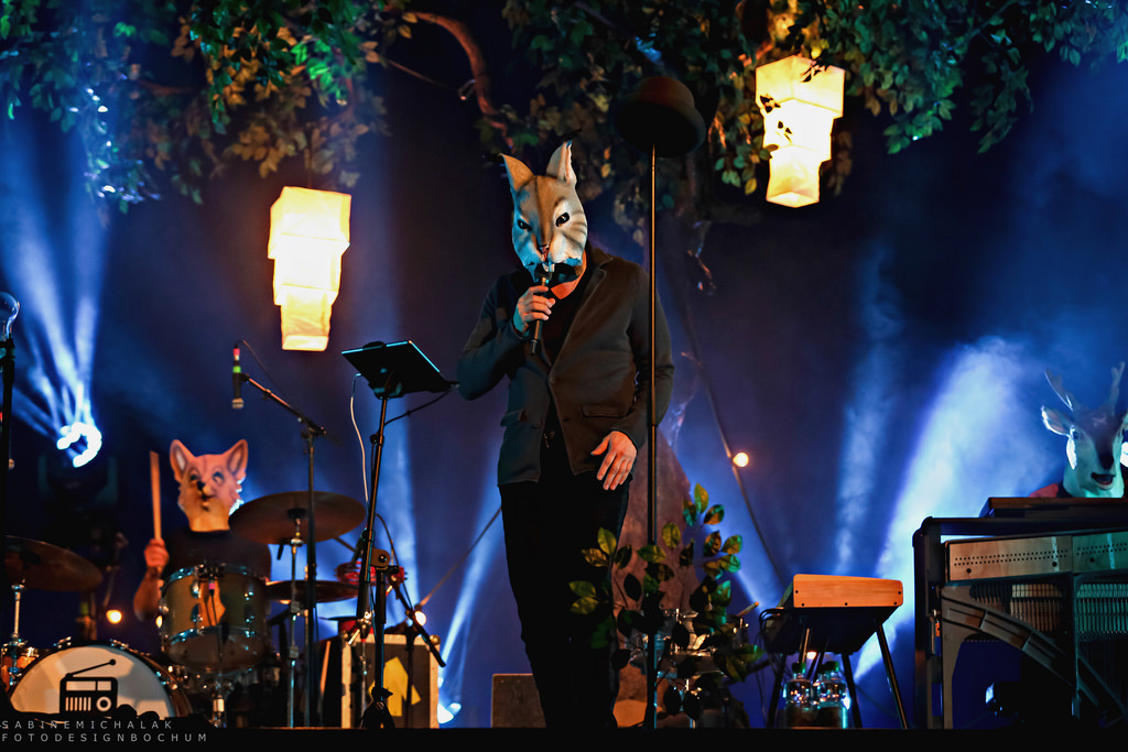 Los ging es mit dem Song „Die Tiere des Waldes“, zu dem die Musiker, mit großen Tiermasken auf den Köpfen, langsam ihren “Zauberwald” betraten, die Grillen zirpten, Lampions leuchteten, Windlichter schmückten einen Baum, der Mitten auf der Bühne stand, alles wirkte seltsam entrückt, fast mystisch.