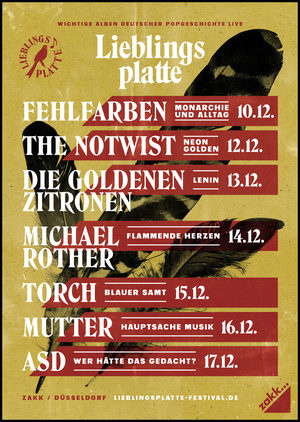 Alle Platten, die zur Aufführung kommen, waren und sind in ihren Genres wichtig, haben Neuland betreten oder künstlerische Grenzen ausgelotet. Der Zeitraum, der mit dem diesjährigen Lieblingsplatte-Festival abgedeckt wird, geht von MICHAEL ROTHERS Solo-Debüt „Flammende Herzen“ aus dem Jahr 1977 bis zum Album „Lenin“ von den GOLDENEN ZITRONEN von 2006. Dazwischen lagen die Veröffentlichungen von FEHLFARBENS „Monarchie und Alltag“, laut Rolling Stone-Bestenliste das wichtigste deutsche Popalbum aller Zeiten. Oder das Meisterwerk der Band MUTTER aus Berlin, die in den 90er Jahren mit „Hauptsache Musik“ die Independent-Rockszene beeindruckte. Oder das Breakthrough-Album der bayrischen Band THE NOTWIST, die seit „Neon Golden“ international gefragt ist und weltweit zu Konzerten eingeladen wird. „Wer hätte das gedacht?“ von ASD und „Blauer Samt“ von TORCH haben in der HipHop Szene Furore gemacht. Torch ist einer der einflussreichsten MCs des Landes und sein bisher einziges Soloalbum ist ein absoluter Meilenstein seines Genre. ASD sind die Supergroup der zweiten Generation des deutschen HipHop, ihr Debütalbum schlug vor dreizehn Jahren in der HipHop Szene ein. Zwei der wortgewaltigsten Rapper des Landes hatten sich zusammengefunden und setzten neue Maßstäbe, was Skills und Flow im deutschen HipHop anging.