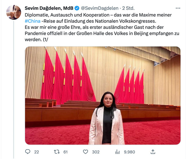 Sevim Dagdelen, Sahra Wagenknechts Sidekick und Bundestagsabgeordnete der Linken, reiste durch China. Sie wurde in der „Großen Halle des Volkes“, dem Sitz des chinesischen Pseudoparlaments, empfangen, besuchte eine von der SPD nahen Friedrich-Ebert-Stiftung mitorganisierte Ausstellung zu Karl Marx und hielt an der Shanghai International Studies University (SISU) einen Gastvortrag. In dem ging es um die deutsch-chinesischen Beziehungen in Zeiten des „Stellvertreterkriegs der NATO in der Ukraine“.