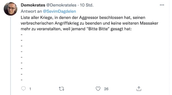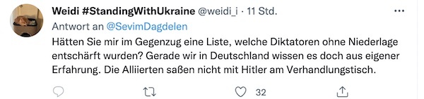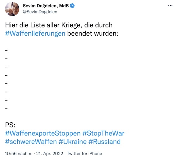 Sevim Dagdelen sitzt für die Linkspartei im Bundestag und ist in der Fraktion die Sprecherin für Internationale Beziehungen und Abrüstung. Vor dem 24. Februar bezweifelte sie die Möglichkeit eines Angriffs Russlands auf die Ukraine. Seitdem die Russen in dem Land einmarschiert sind, setzt sie sich dafür ein, dass sich die Ukraine nicht gegen die russische Armee wehren kann. Sie fordert Verhandlungen, an denen der russische Präsident Putin kein wirkliches Interesse hat, und ist strikt gegen Waffenlieferungen.