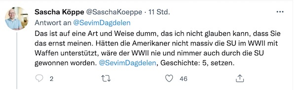 Daraufhin erteilten ihr zahlreiche ihrer Follower auf Twitter eine Nachhilfestunde in Geschichte, die Dagdelen offenbar dringen nötig hat: