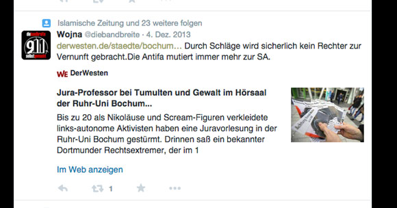 Als Studenten der Ruhr Uni 2013 den Neonazi Michael Brück outeten, verglich Bandbreite-Sänger Wojna die Nazi-Gegner mit der SA: