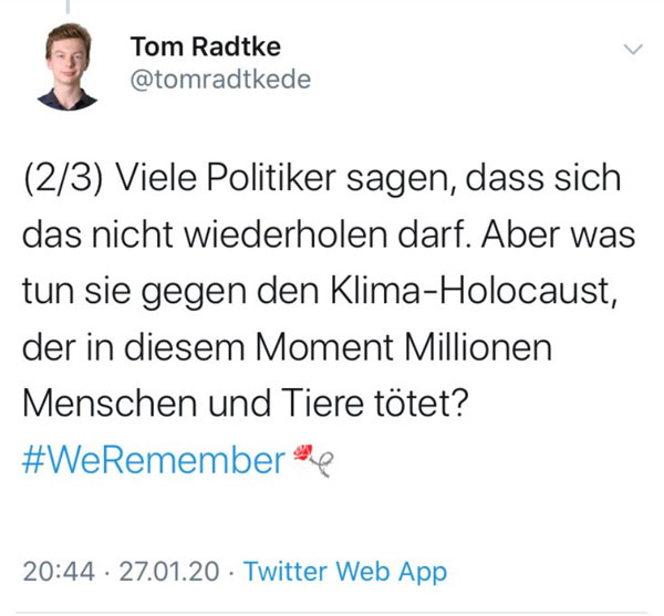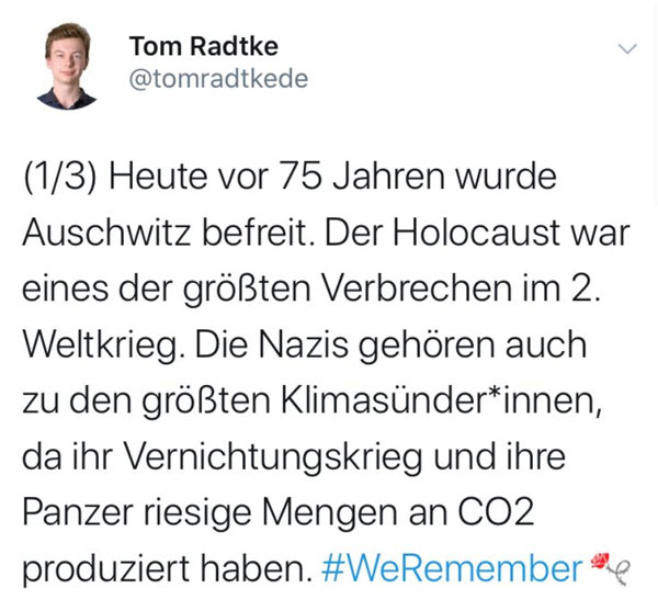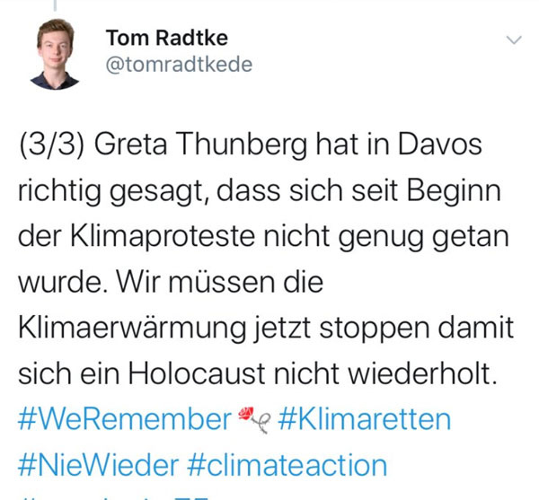 Natürlich stimmt, was Fridays for Future geschrieben hat: Radtkes Verhalten ist schockierend und nicht zu entschuldigen. Aber zu erklären ist es. Wenn jungen Menschen seit nunmehr über einem Jahr permanent erklärt wird, der Weltuntergang stehe kurz bevor und die Industrie, unsere Lebensweise, der Kapitalismus und die „alten weißen Männer“ würden an ihrer Vernichtung arbeiten und der Planet sei dabei, sich in eine öde, durch das Weltall taumelnde Geröllkugel zu verwandeln, wenn Endzeitsekten wie Extinction Rebellion gehypt werden und eine Wochenzeitung wie „Die Zeit“ Auflage und Klickzahlen zunehmend mit Paniac-Berichterstattung und autoritären Verbotsphantasien macht, bleibt das nicht ohne Folgen. Der weitgehende Verlust einer differenzierten Berichterstattung, die Mutation von Journalisten zu Klimaaktivisten hat einen großen Anteil daran, dass jemand wie Radtke einen den Holocaust relativierenden Dreck schreibt. Und wo wir bei Verantwortung sind: Auch seine Eltern und Lehrer haben versagt, denn ihre Aufgabe wäre es gewesen, dem Jungen zu erklären, was der Holocaust war – und dass er nicht mit dem Bienensterben zu vergleichen ist. Es ist die hysterische Atmosphäre die wir zur Zeit erleben, welche die Radtkes hervorbringt. Denn was er geschrieben hat, wird er wahrscheinlich vorher bereits ein paar Mal gesagt haben – und offenbar ist ihm niemand ins Wort gefallen.