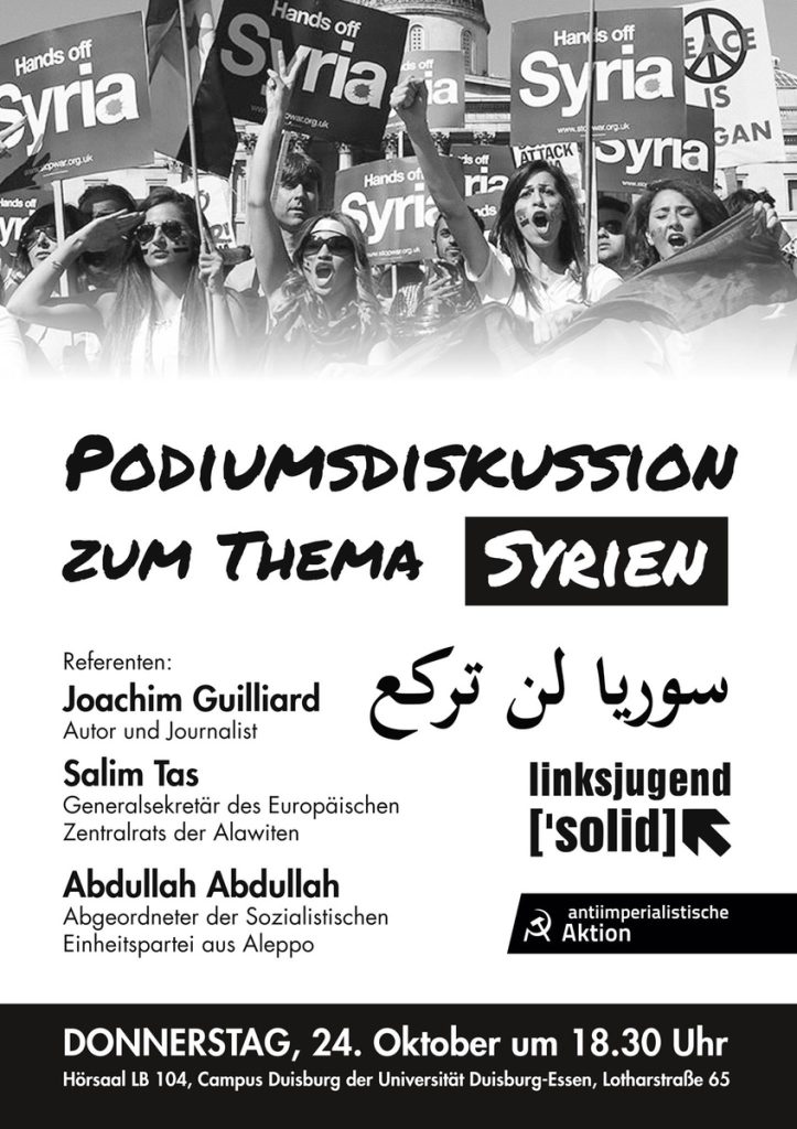 Um diesen gleichgeschalteten Massenmedien zu trotzen und eine objektive Analyse über die aktuelle Lage in und um Syrien zu liefern, laden wir zu einer Podiumsdiskussion mit Joachim Guilliard, Salim Tas (Generalsekretär des Europäischen Zentralrats der Alawiten und Vorsitzender des Bundes der Alawitischen Jugend , M.N.) und Abdullah Abdullah auf dem Campus Duisburg der Universität Duisburg-Essen ein!“