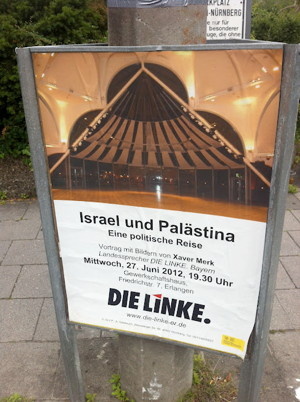 Nun reden wir hier aber von der Linkspartei. Das bedeutet, man muss Abstriche machen. Was tut also die bayerische Linke? Sie beschäftigt sich primär mit dem Nahostkonflikt. Der Landesvorsitzende Xaver Merk ging auf Reise durch „Israel und Palästina“, brachte viele Bilder mit und veranstaltet nun eine Tournee durch Bayern. In diversen bayerischen Städten werden nun Diaabende von der lokalen Linkspartei veranstaltet. Zwingend logisch, oder?