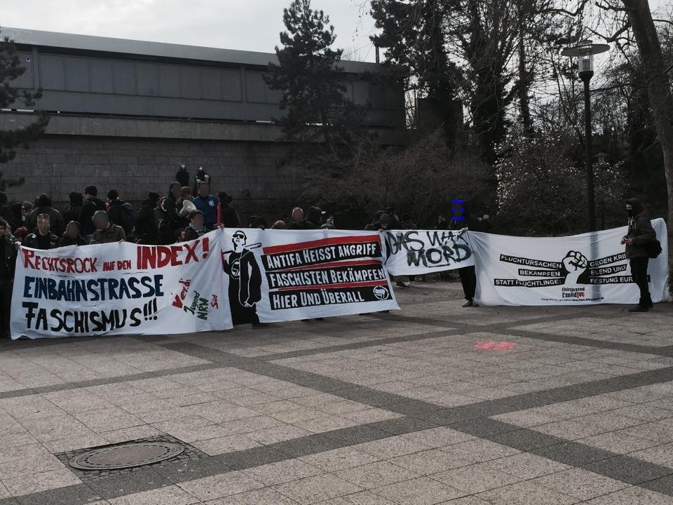 14.30 Uhr: An der Strecke der Nazis hat sich vereinzelt bürgerlicher Widerstand gebildet, ein paar Sprechchöre. Ansonsten geht es für die 600 Nazis und Hooligans brüllend und pöbelnd durch ein quasi ausgestorbenes Wohngebiet.