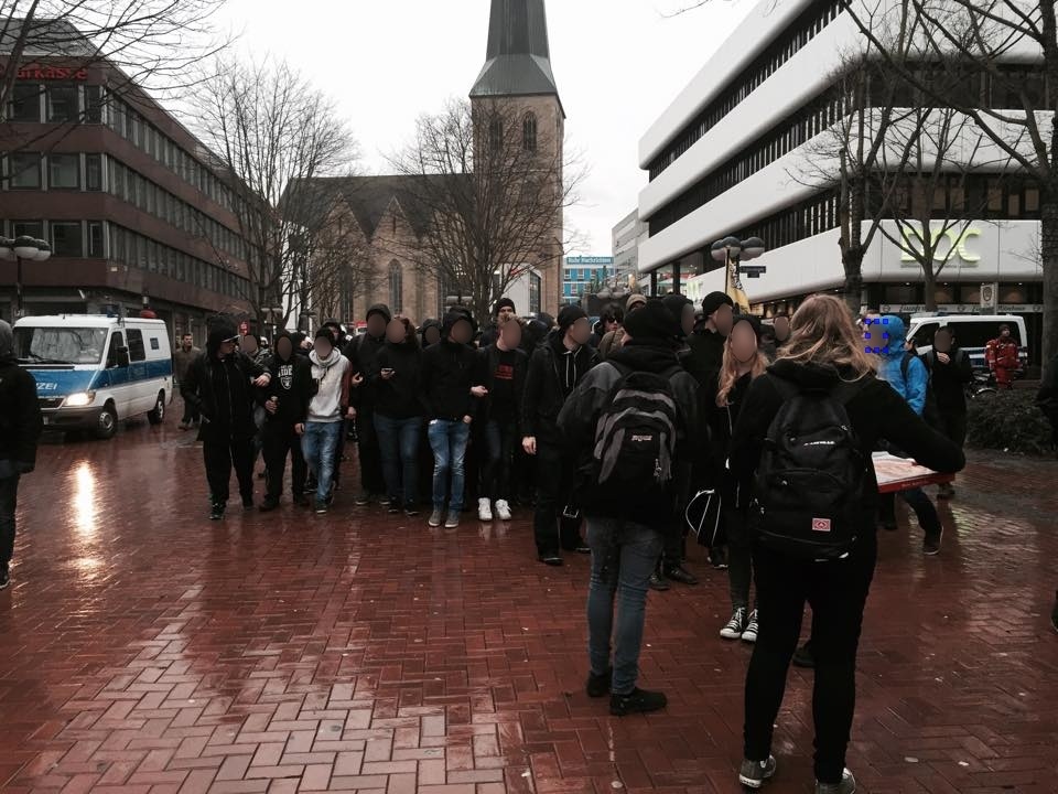 16.32 Uhr: Der Trauermarsch für Thomas Schulz ist beendet worden. An der Kampstraße/Westentor kommt es zu Böllerwürfen, Rauch und Gerangel. Die Polizei geht in die Demonstraton. Einzelne Teilnehmer werden von der Polizei herausgezogen.