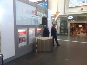10.57 Uhr: Der öffentliche Personennahverkehr der Bahn funktioniert. Ca. 3-400 Gegendemonstranten sind gerade am Dortmunder Hauptbahnhof angekommen. Empfangen wurden sie von einem massiven Polizeiaufgebot und dem, was man als „Alleinunterhalterin“ bezeichnen kann. Mit deeskalierender Stimme weist sie die Ankömmlinge darauf hin, doch bitte ruhig aus dem Bahnhof zu gehen…