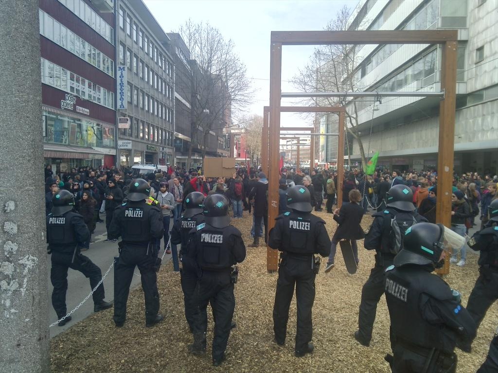 16.27 Uhr: Überhaupt macht es die Polizei den Teilnehmern des Gegenprotestes nicht leicht. Mehr oder weniger stolz können knapp 20 Teilnehmer eines Minimalstprotestes auf der Strobelallee nun ihre blauen Flecken zeigen, die sie dem Einsatz der Polizei zu verdanken haben, die der Ansicht war, 20 Protestrufer könne man den Nazis in 100 Meter Entfernung nicht zumuten und das Grüppchen abdrängte…