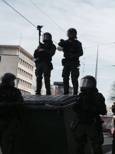 13.26 Uhr: Die Polizei bereitet sich auf den bevorstehenden Nazi Zug vor und verlegt ihre Wasserwerfer und die Reiterei in die Saarlandstraße.