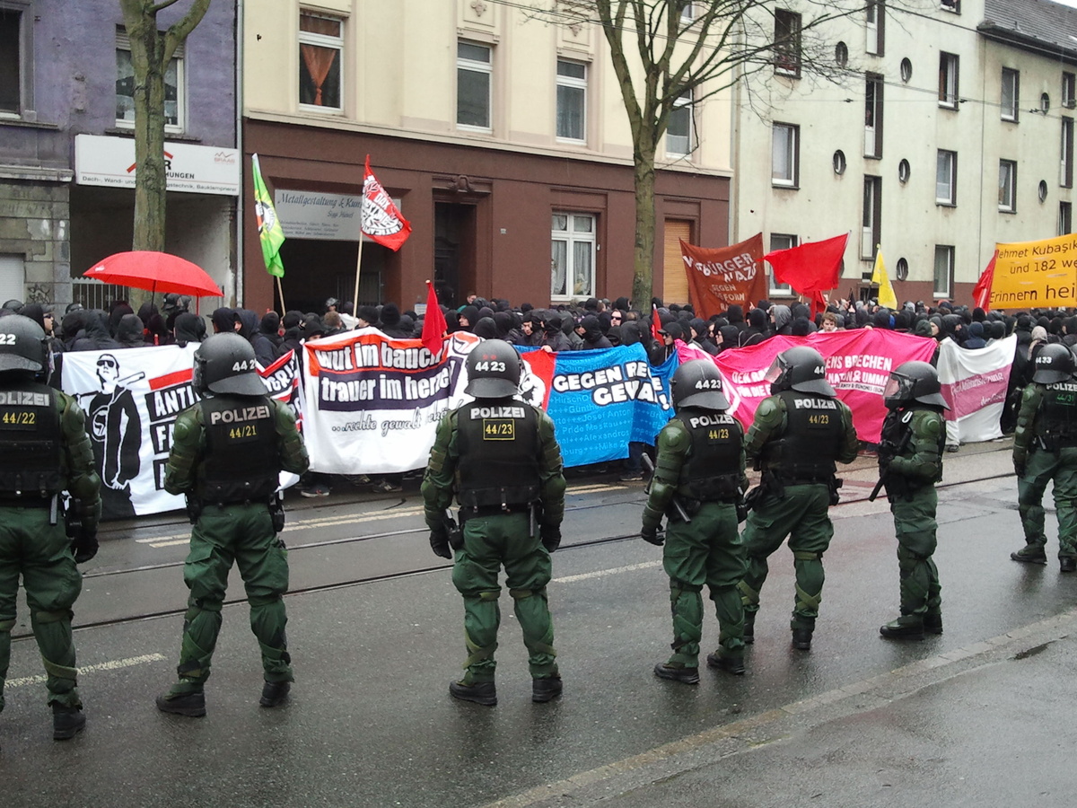 13.38 Uhr: Unter Begleitung der Polizei dürfen knapp 200 Demonstranten von der Kampstraße in Richtung Dorstfeld zur Gedenkkundgebung für Thomas Schulz gehen. Gleichzeitig ruft Blockado dazu auf, sich dieser Kundgebung anzuschließen.