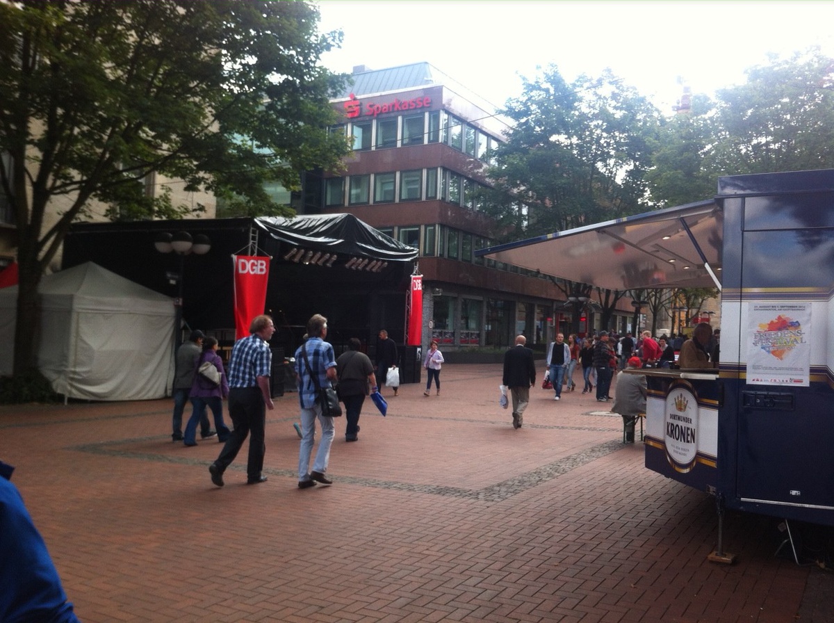 12.39 Uhr: Nicht alle Nachrichten sind gut. Auf Friedensfest des DGB Dortmund, am Katharinentor, befinden sich derzeit lediglich einige Dutzend Teilnehmer.
