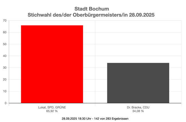 18.31 Uhr: Bochum ist die Wahl gelaufen: Jörg Lukat (SPD), der Kandidat von SPD und Grünen, liegt uneinholbar vor Andreas Bracke (CDU):