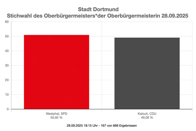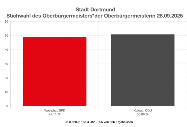 18.36 Uhr: In Dortmund steht der Machtwechsel bevor: CDU-Kandidat Alexander Kalouti liegt bei über 90 % ausgezählten Stimmbezirken mit 52,61 prozent zu klarvor Amtsinhaber Thomas Westphal (SPD), der auf 47,39 Prozent kommt.