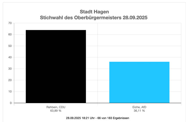18.22 Uhr: In Hagen liegt Dennis Rehbein, der Kandidat der CDU vor deutlich Michael Eiche (AfD), nachdem schon ein Drittel der Stimmen ausgezählt wurden: