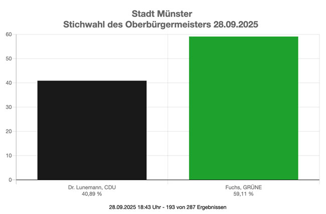18.43 Uhr: Münster bekommt einen grünen OB: Tilmann Fuchs (Bündnis90/Die Grünen) schlägt Georg Lunemann (CDU):