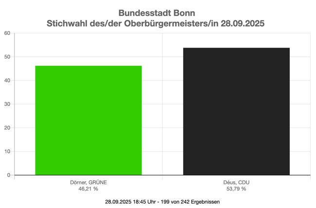 18.46 Uhr: Bonns OB Katja Dörner (Bündnis 90/Die Grünen) verliert klar gegen Guido Déus (CDU).