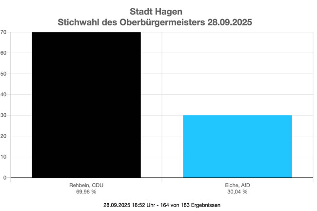 18.54 Uhr: In Hagen hat Dennis Rehbein, der Kandidat der CDU, Michael Eiche (AfD) deutlich geschlagen: