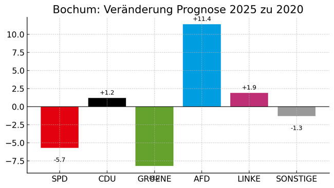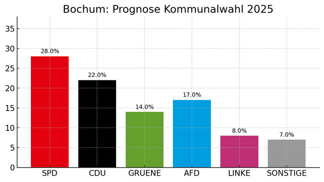20.26: In Bochum wird die SPD nach der Auszählung von 211 von 283 Wahllokalen zwar die stärkste Fraktion stellen, aber sie rutscht mit nur noch 28,29 % deutliche unter der 30 %-Marke. Auf dem zweiten Platz liegt die CDU mit 18,7 5. Die AfD zieht mit 16,65 % an den Grünen vorbei, die auf 13,34 % kommen.