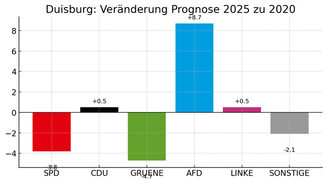 20.05: In Duisburg sind bei der Wahl des Rates 395 von 448 Wahllokalen ausgezählt. Die SPD führt mit 32,71 %. Zweitstärkste Fraktion wird die AfD werden, die nun bei 21,39 % liegt.