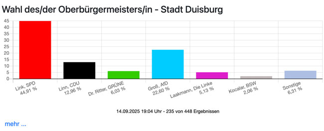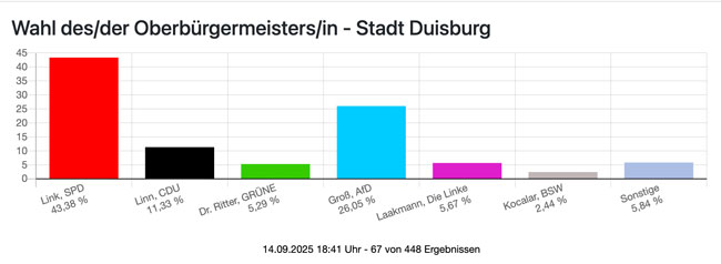 19.10 Uhr: Nachdem in Gelsenkirchen und Duisburg über die Hälfte der Wahllokale die Stimmen zur OB-Wahl ausgezählt haben ist klar, dass in beiden Städten die Kandidaten von SPD und AfD in die Stichwahl kommen: