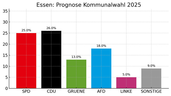 19.38 Uhr: In Essen verliert nicht nur Oberbürgermeister Thomas Kufen stark, auch die CDU-Ratsfraktion muss voraussichtlich deutliche Verluste hinnehmen. Nach Auszählung von 135 der 428 Stimmbezirke bei der Ratswahl kommt die CDU auf 26,8 Prozent, auch hier liefern sich SPD und AfD ein Kopf-an-Kopf-Rennen um Platz 2 mit jeweils um die 21. Prozent. Die Grünen kommen auf 11 Prozent. Vor fünf Jahren sah das Ergebnis so aus: CDU 34,4 Prozent, SPD 24,2 Prozent, Grüne 18,6 Prozent. Großer Gewinner ist die AfD, die ihren Stimmenanteil in Essen gegenüber 2020 diesmal mehr als verdreifachen kann.