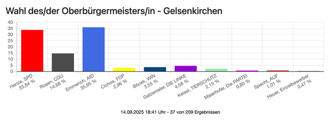 21.25 Uhr: Die SPD schlägt die AfD in Gelsenkirchen in einem Fotofinish bei der Wahl des Rates knapp mit 30,36 % zu 29,92 %. Die CDU schafft gerade einmal 19 %, die Grünen nur 4,6 %. Bei der OB-Stichwahl muss Andrea Henze (SPD, 37,04%) gegen Norbert Emmerich (AfD, 29,75 %) antreten. AfD und SPD kommen auf je 20 Sitze im Stadtrat. Die AfD gewann satte 17,5 Prozent in ihrer Hochburg hinzu, die SPD verlor 4,7 Prozent. Die Grünen gingen mit 4,63 Prozent (minus 7,61 Prozent) förmlich unter, die CDU erhielt noch 19,16 Prozent (minus 4,06).