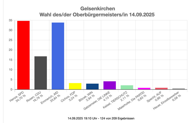 21.25 Uhr: Die SPD schlägt die AfD in Gelsenkirchen in einem Fotofinish bei der Wahl des Rates knapp mit 30,36 % zu 29,92 %. Die CDU schafft gerade einmal 19 %, die Grünen nur 4,6 %. Bei der OB-Stichwahl muss Andrea Henze (SPD, 37,04%) gegen Norbert Emmerich (AfD, 29,75 %) antreten. AfD und SPD kommen auf je 20 Sitze im Stadtrat. Die AfD gewann satte 17,5 Prozent in ihrer Hochburg hinzu, die SPD verlor 4,7 Prozent. Die Grünen gingen mit 4,63 Prozent (minus 7,61 Prozent) förmlich unter, die CDU erhielt noch 19,16 Prozent (minus 4,06).