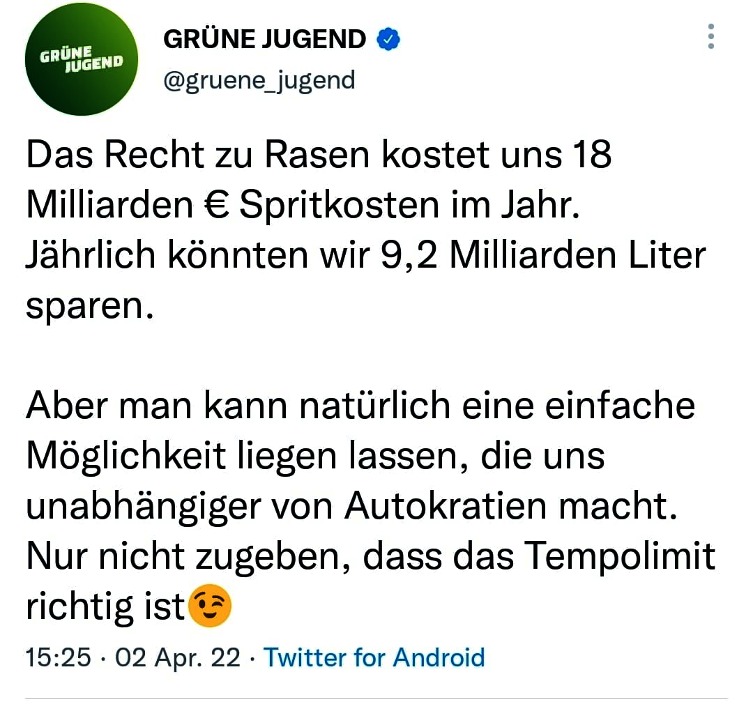 9,2 Milliarden Liter könnte ein Tempolimit jährlich einsparen, so die Aussage der Grünen Jugend auf Twitter. Eine gewagte These, da im Straßenverkehr in Deutschland jährlich 42 Milliarden Liter verbraucht werden. Selbstverständlich sind die von der GJ angeführten 22 % Einsparungspotential falsch. Es liegt bei etwa 600 Millionen Litern – die korrekte Berechnung hierzu stammt von der eigenen Mutterpartei, den Grünen. Die GJ verschätzt sich also um etwa um den Faktor 15. Obwohl bei Twitter mehrfach auf den Fehler hingewiesen wird, erfolgt keine Korrektur. Wieso auch, es passt schließlich in das Weltbild.