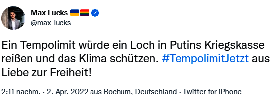 Noch absurder wird es, wenn politische Mandatsträger dann auch noch bar jeder Fachkenntnis behaupten, ein Tempolimit könne ein „Loch in Putin Kriegskasse reißen“, wie es beispielsweise der Bundestagsabgeordnete der Grünen, Max Lucks, tut.
