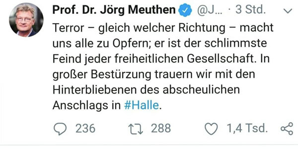 Am Tag des Anschlags twitterte Meuthen, dass jede Form von Terrorismus zu verurteilen sei. Es war ihm selbst dann nicht möglich es als rechtsradikalen Akt des Terrors zu bezeichnen als bereits klar war, dass der Neonazi den Holocaust geleugnet hat in seinem Live Stream.