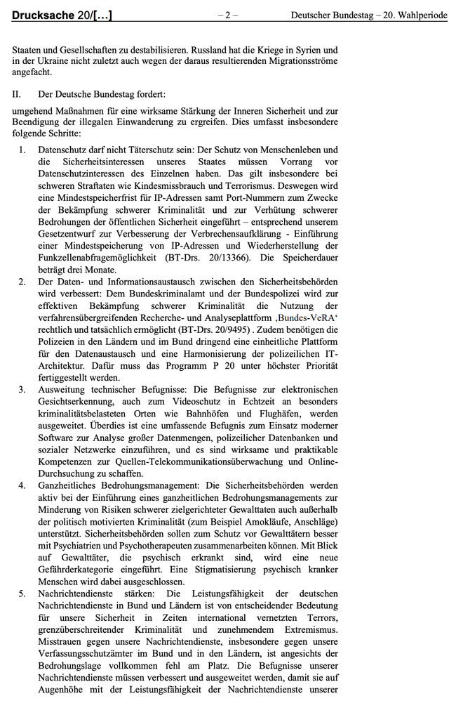 Auch wird die AfD ein Problem damit haben, wenn die Union fordert: „Es braucht insbesondere einen starken Verfassungsschutz, der die Öffentlichkeit über extremistische Bestrebungen, auch in Parteien, aufklärt.“