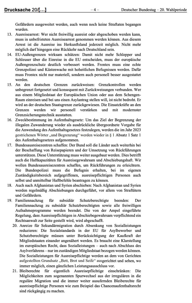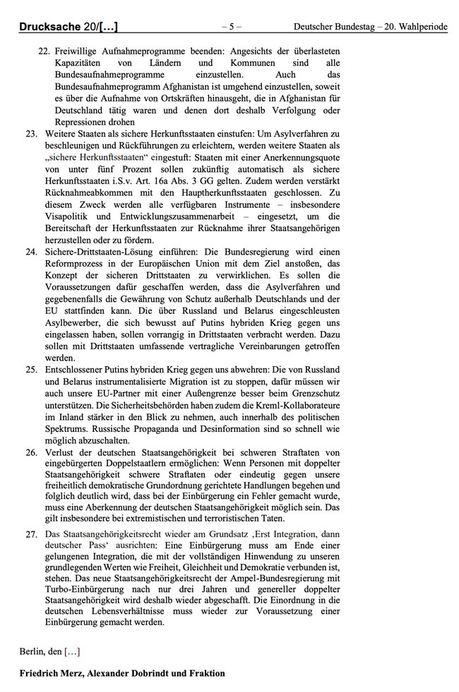 Der Antrag, den die Unionsfraktion in der kommenden Woche in den Bundestag einbringen kann, stellt eine Zäsur in der deutschen Migrationspolitik dar. Doch die Union hat ihn so formuliert, dass die AfD und auch das BSW ihm nur unter dem Preis der Selbstverleugnung zustimmen könnten. Remigration gehört zu den Kernforderungen der AfD im Bundestagswahlkampf. Im Antrag der Union wird das Konzept der Remigration als nicht verfassungskonform bezeichnet. Illegale Migration wird von der Union als „eines der vielen Mittel von Putins hybridem Krieg gegen uns“ bezeichnet. Asylbewerber würden zielgerichtet aus Drittstaaten eingeflogen und in den Westen geschleust, um Staaten und Gesellschaften zu destabilisieren: „Russland hat die Kriege in Syrien und in der Ukraine nicht zuletzt auch wegen der daraus resultierenden Migrationsströme angefacht.“ Dass sich AfD und BSW so deutlich gegen Russland stellen, ist kaum zu erwarten.