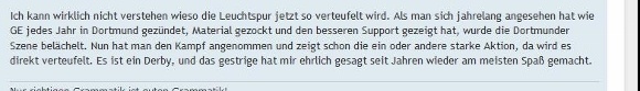 Man sieht daran, es handelt sich keineswegs um ein Problem der Dortmunder Borussia, sondern es wird rasch deutlich, dass es eigentlich Anhänger (fast) aller Vereine zu betreffen scheint. Wobei das Augenmerk der Medien naturgemäß auf der von der Öffentlichkeit meistbeachteten Begegnung des Wochenendes lag und liegt. Und das war eben das Derby.