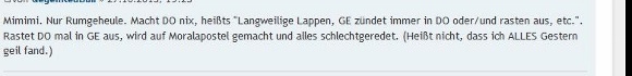Bei solchen Äußerungen, wie sie dort im Netz haufenweise getroffen werden, da hilft wohl längst auch keine kurzfristige Erziehungsmaßnahme mehr, da scheint mir schon deutlich mehr im Argen zu liegen.