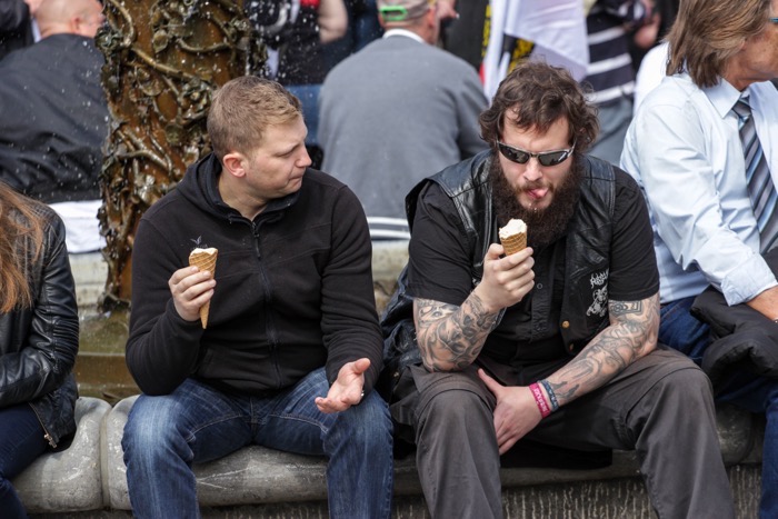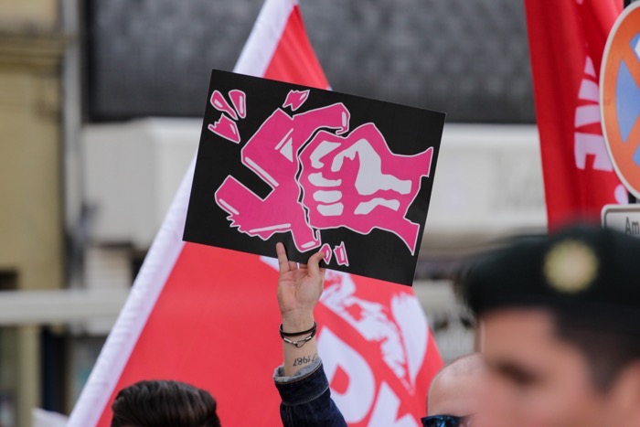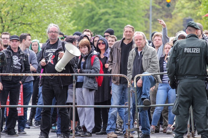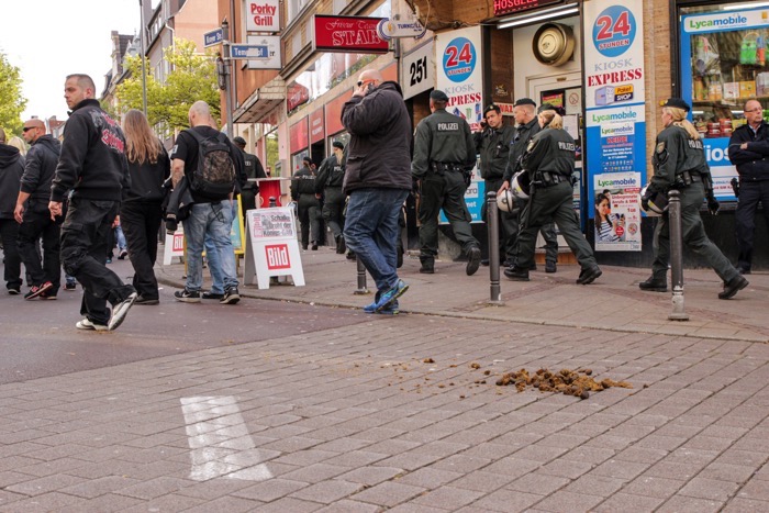 Die Handlung: Mit den typischen Sprechchören den Hauptbahnhof zu beschallen, wollte nicht so recht klappen – vielleicht steckte zu vielen noch das Einläuten des „Tags der Arbeit“ in den Knochen. Bei einigen zumindest schien das (Konter-)Bier zur Tagesrequisite zu gehören. Also versuchten sich einige der Hauptdarsteller darin, Reisende und Medienschaffende mit Beschimpfungen und Bedrohungen ins Stück zu involvieren. Die Nebendarsteller mahnten denn auch die Journalistinnen und Journalisten zur Zurückhaltung, um die Nazis nicht durch Anwesenheit und Fotos zu provozieren. Nach rund anderthalb Stunden verließen die Darsteller die Bühne in Richtung Essen.