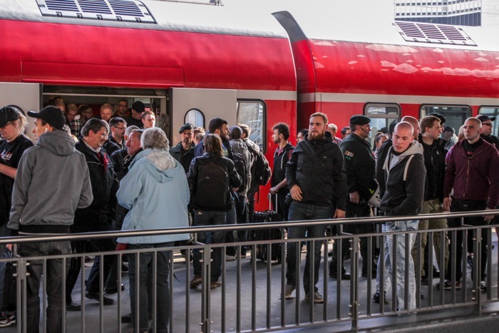 90 Nazis im Hauptbahnhof versammelt hatte. Verwunderlich war eher, dass sich die Rechtsextremisten, die durch Auftreten, Gesichtstattoos und Kleidung als Nazis gut erkennbar waren, sich vollkommen ungestört im Bahnhofsbereich bewegen konnten. Unangenehm wurde die Situation, als sich die Nazis in der engen Bahnunterführung vor den Aufgängen zu den Gleisen dicht gedrängt versammelten, rechte Parolen riefen und insgesamt sehr aggressiv auftraten. Die anderen Reisenden, darunter viele Migranten, mussten sich durch den Pulk pöbelnden Nazis – darunter einige der Gewalttäter des Dortmunder Rathausüberfalls – wortwörtlich hindurch quetschen. Einige sahen verängstigt aus. Während der Wartezeit in der Bahnunterführung tranken sich die Nazikameraden mit Flasche Bier in der Hand in die „richtige Stimmung“. Passanten und Journalisten wurden heftig beschimpft. Einer der Bundespolizisten meinte: „Wir sind hier zu wenig Leute“.