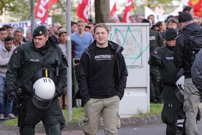 Ich kann nicht verstehen, warum der Brück mit diesem T-Shirt, offensichtlich noch unter Polizeischutz, durch Essen laufen kann.