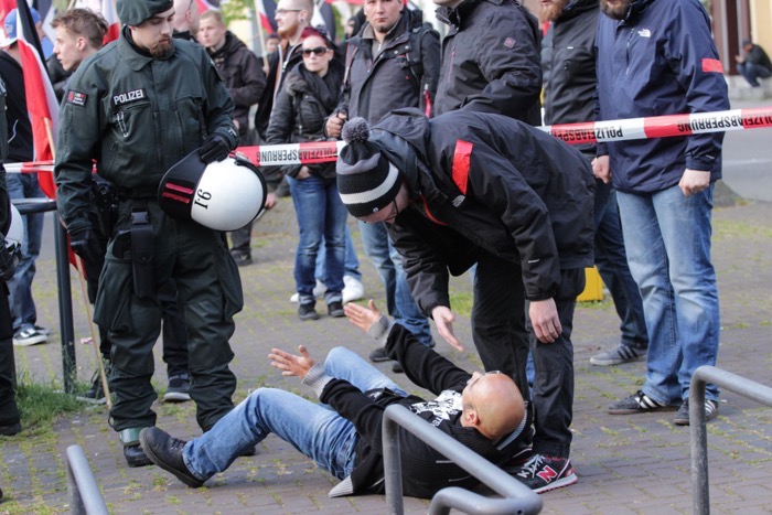 Ob das der Grund dafür war, dass sie die Anzeige gegen den Rechten, der mit erhobenen Fäusten wüst schimpfend auf eine Journalistin dieses Blog zurannte, nicht aufgenommen wurde? Drei Beamte schafften es gerade noch, den 2-Meter-Mann mit ordentlich Krafteinsatz aufzuhalten. Dieselben Beamten lachten die Journalistin aus, als sie Anzeige erstatten wollte. Man solle doch am nächsten Tag zur Wache gehen, die Personalien des Nazis würde man aus polizeitaktischen Gründen nicht aufnehmen. Die Pressestelle der Bundespolizei sicherte nach der Beschwerde des Herausgebers dieses Blogs zu, sich um die Sache zu kümmern.